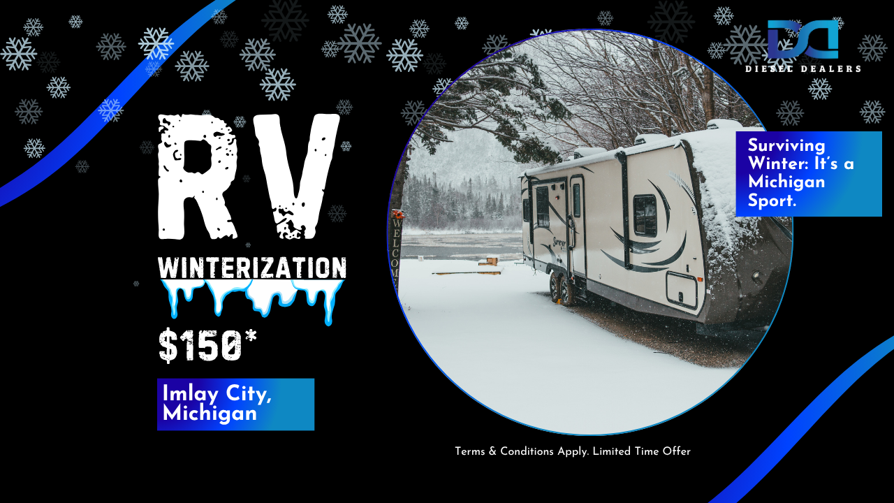 Summer is over, fall is rolling in, and that RV or camper isn't going to Winterize itself. Save on an RV winterization at Diesel Dealers in Imlay City, Michigan today! Terms and conditions apply.